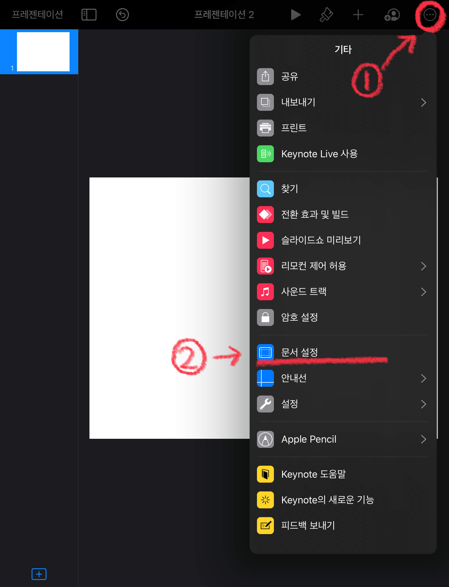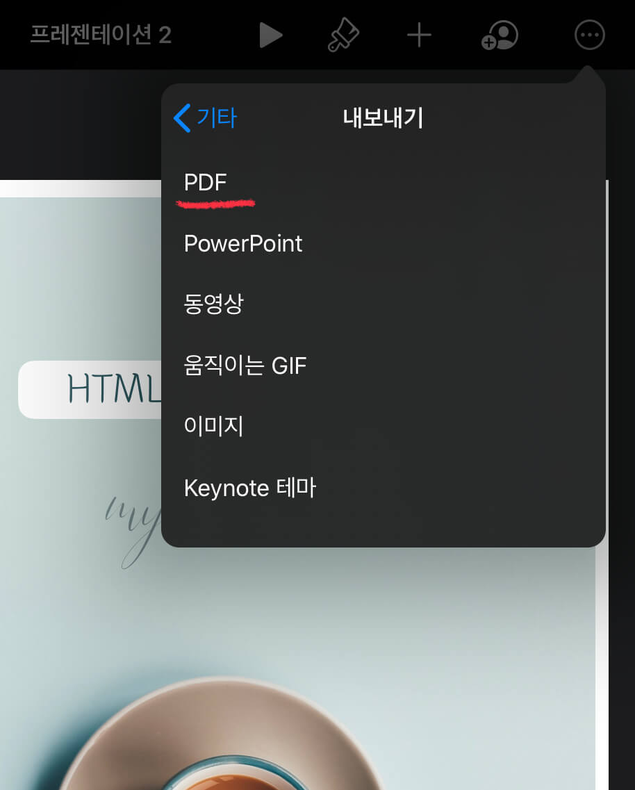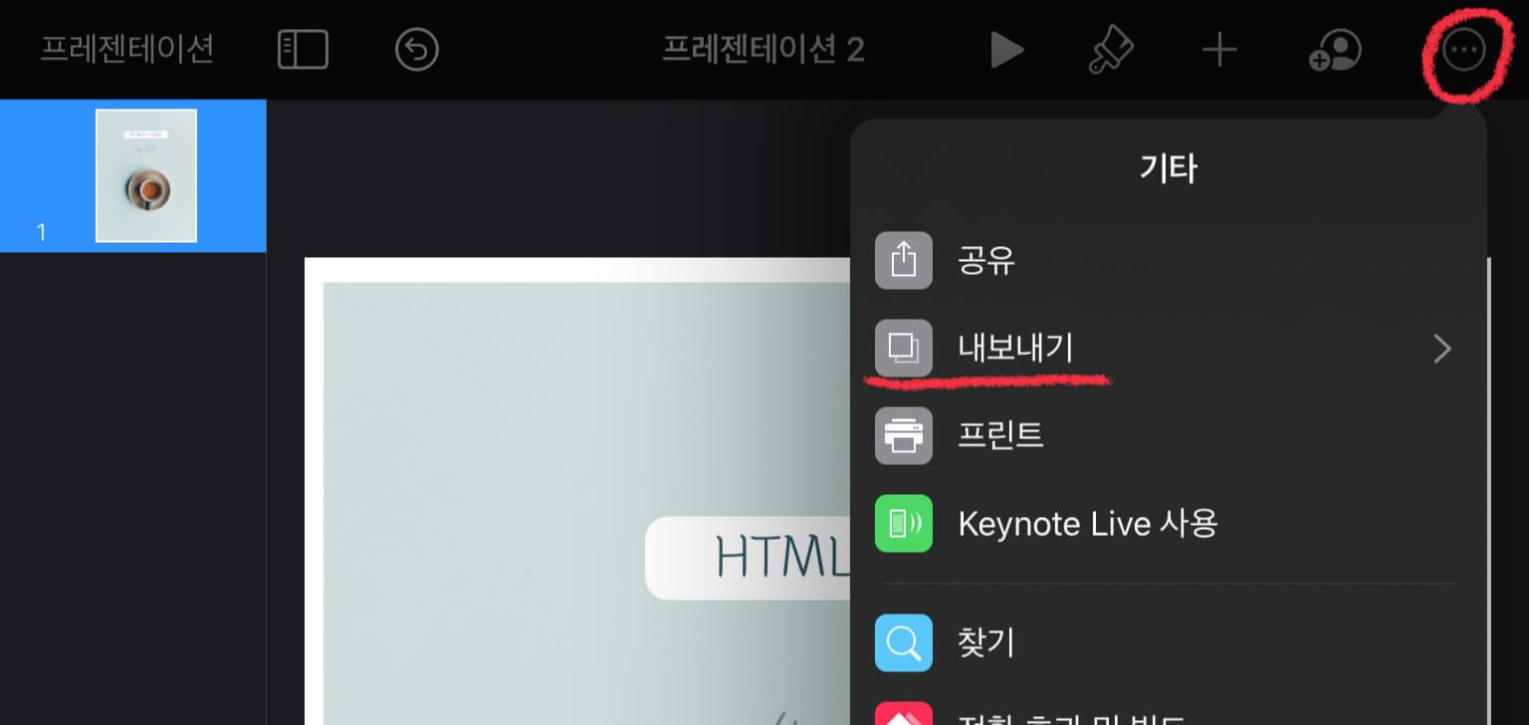 이제 키노트에서 만든 표지를 굿노트로 내보내야 합니다. 우측 상단 [ . . . ]을 누르고 [내보내기]를 눌러주세요.