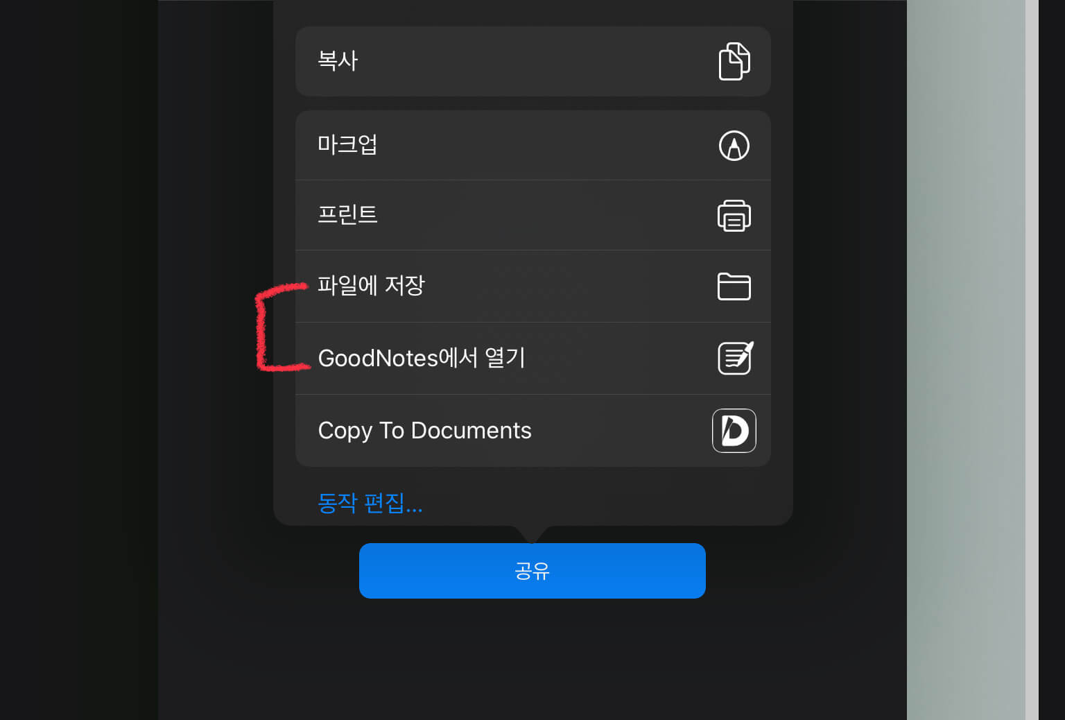 그리고 [PDF]로 설정해준 뒤, [파일에 저장]을 해주세요. 굿노트에서 열기를 눌렀을때 간혹 안열리는 경우가 있더라고요.