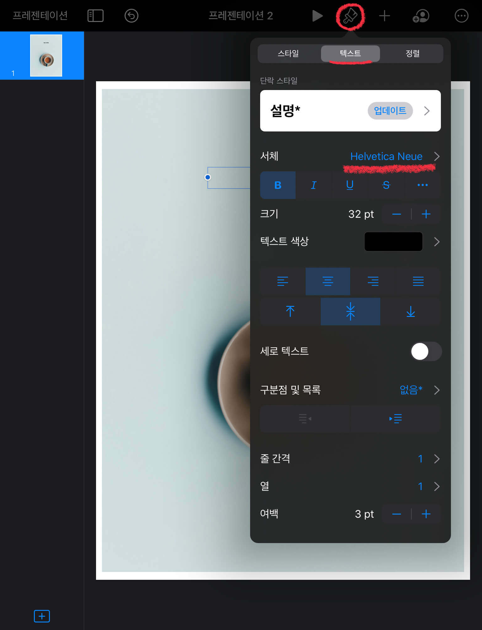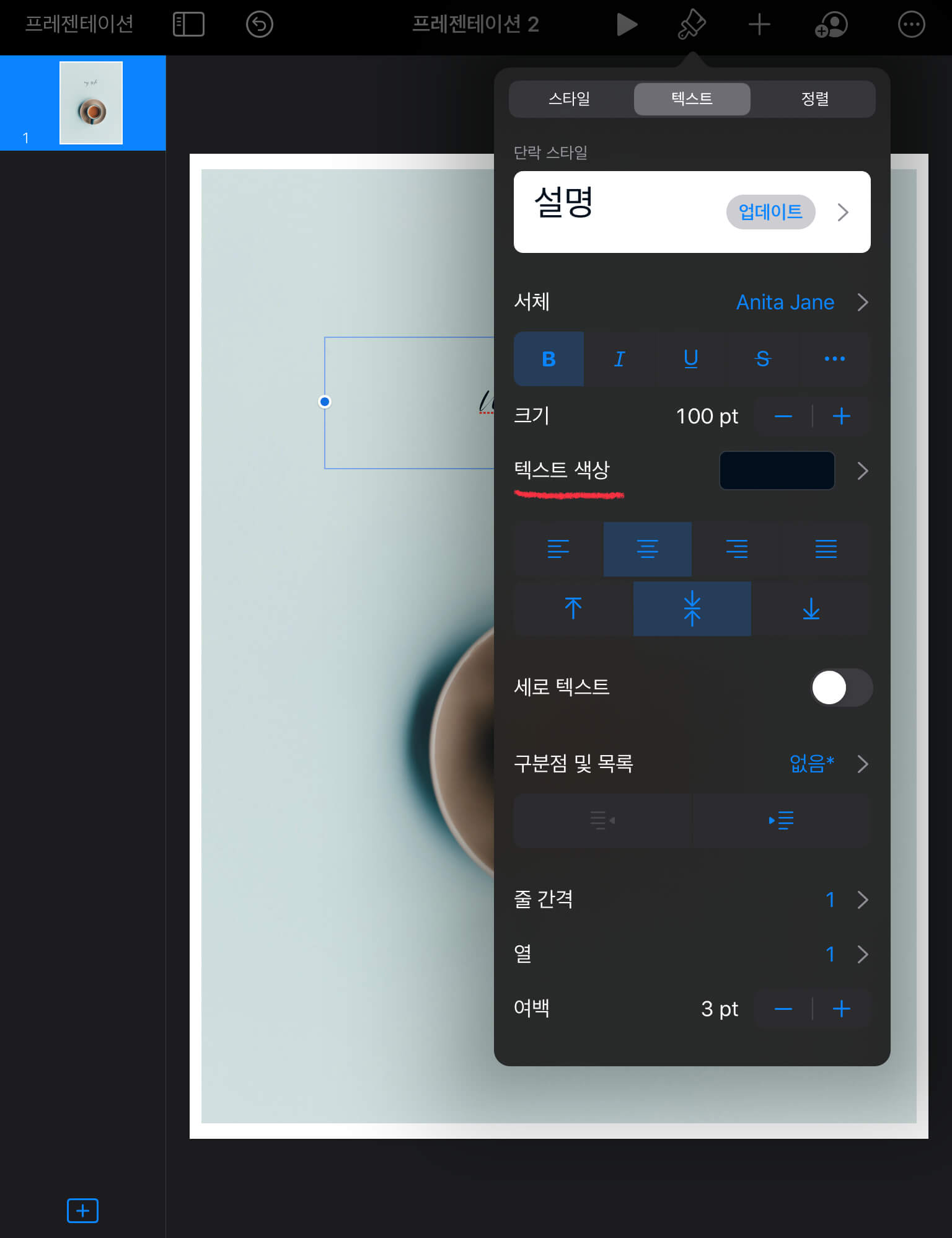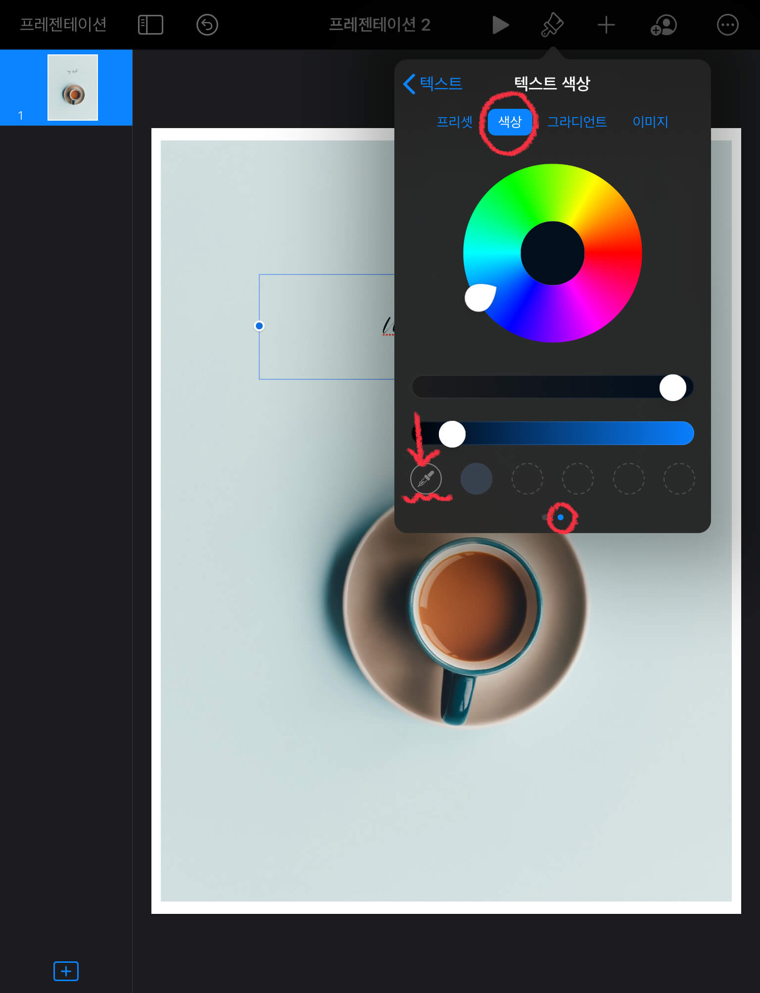 참고로 색상을 변경하고 싶을때, 키노트에서는 [스포이드] 기능을 통해서 기존의 이미지 색상을 추출 할 수 있습니다. 아래와 같이 [붓] - [텍스트] - [텍스트 색상] - [색상] - [오른쪽으로 스와이프] - [스포이드] 기능을 이용하면 이미지와 어울리는 텍스트 색상을 쉽게 설정할 수 있습니다.