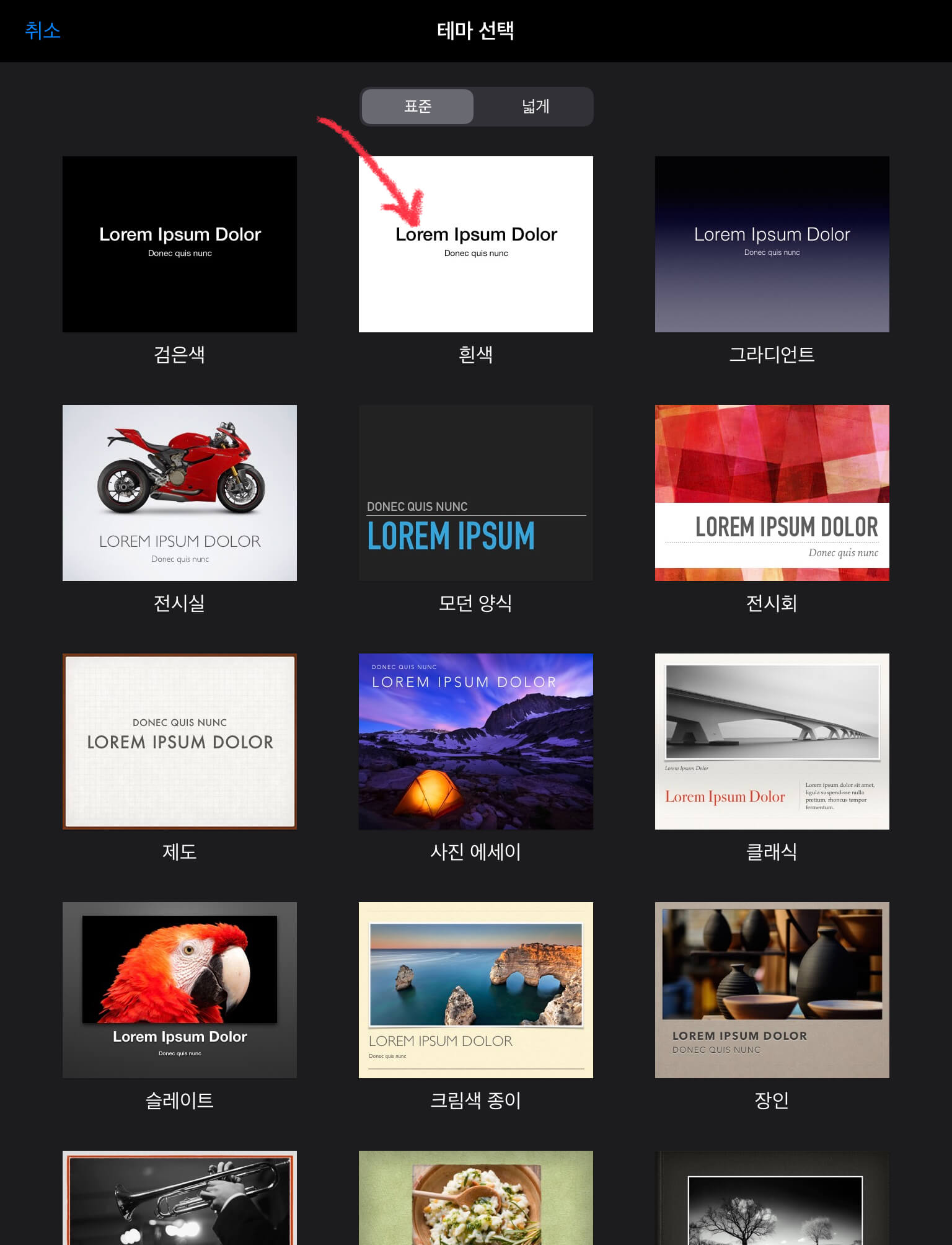 먼저 아이패드에서 [키노트]를 열어주세요. 그리고 [프레젠테이션 생성] 을 누르면 아래와 같은 화면이 나옵니다.