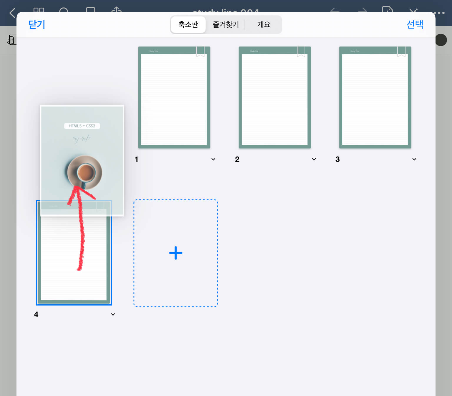 그러면 표지가 가장 마지막에 위치하게 되는데요. 이때 표지를 맨 앞으로 페이지 이동을 하고싶을때에는, 표지를 [꾹 누른채 이동]하면 됩니다.