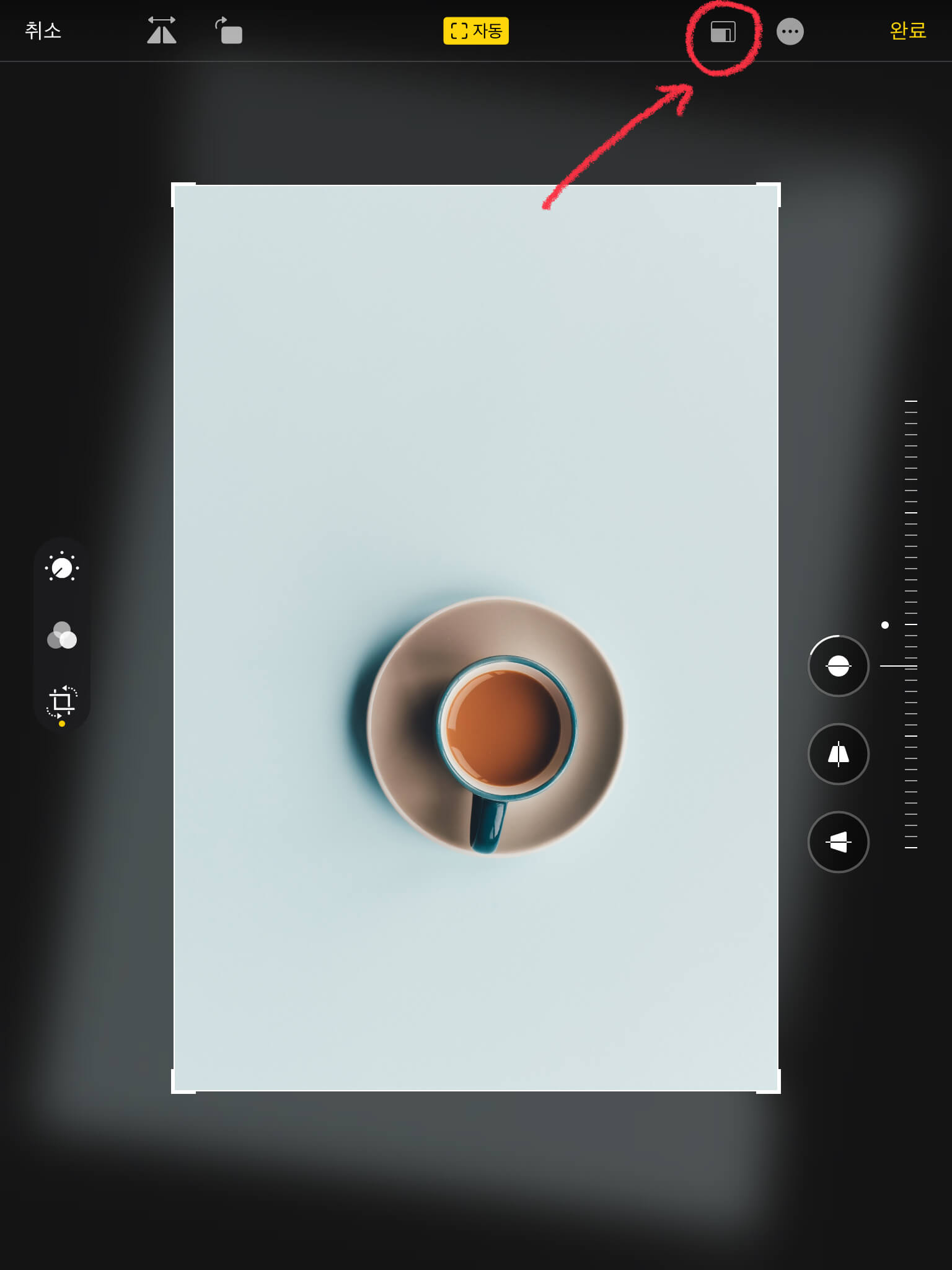 표지에 쓸 이미지를 선택한 후 우측 상단의 [편집]을 누릅니다. (이때 패드 방향을 세로로 해주세요) 그리고 왼쪽의 [자르기] 버튼을 누르면 이미지를 자르거나 크기를 변경할 수 있습니다.