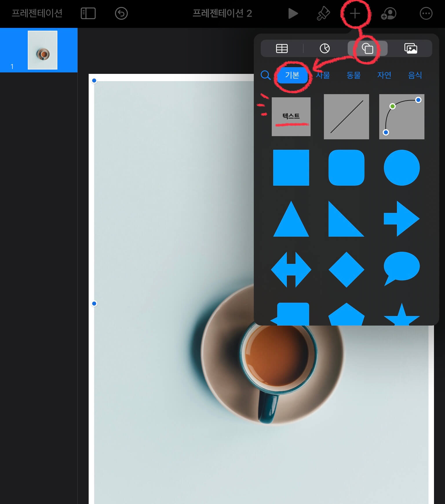 원하는 텍스트를 키노트에 넣기 위해서는 [+] - [도형] - [기본] - [텍스트]를 선택해줍니다.