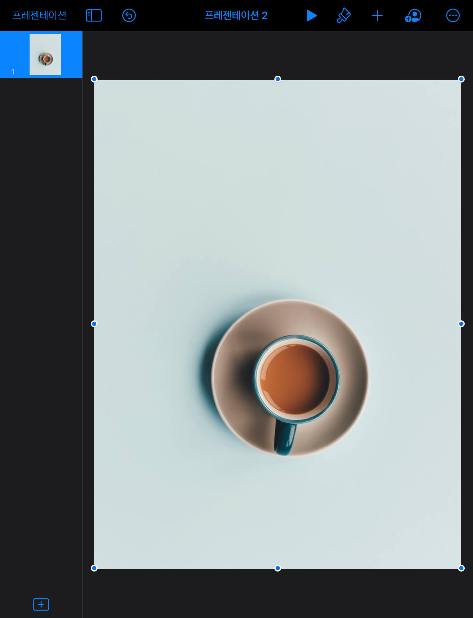 이제 다시 [키노트]로 돌아가서 이미지를 불러옵니다. 키노트에서 이미지 불러오는 방법은 상단 오른쪽 [+] 버튼을 누르고 [사진 또는 이미지]를 누르면 됩니다. 크기를 3:4로 변경해준 표지 이미지를 불러옵니다.