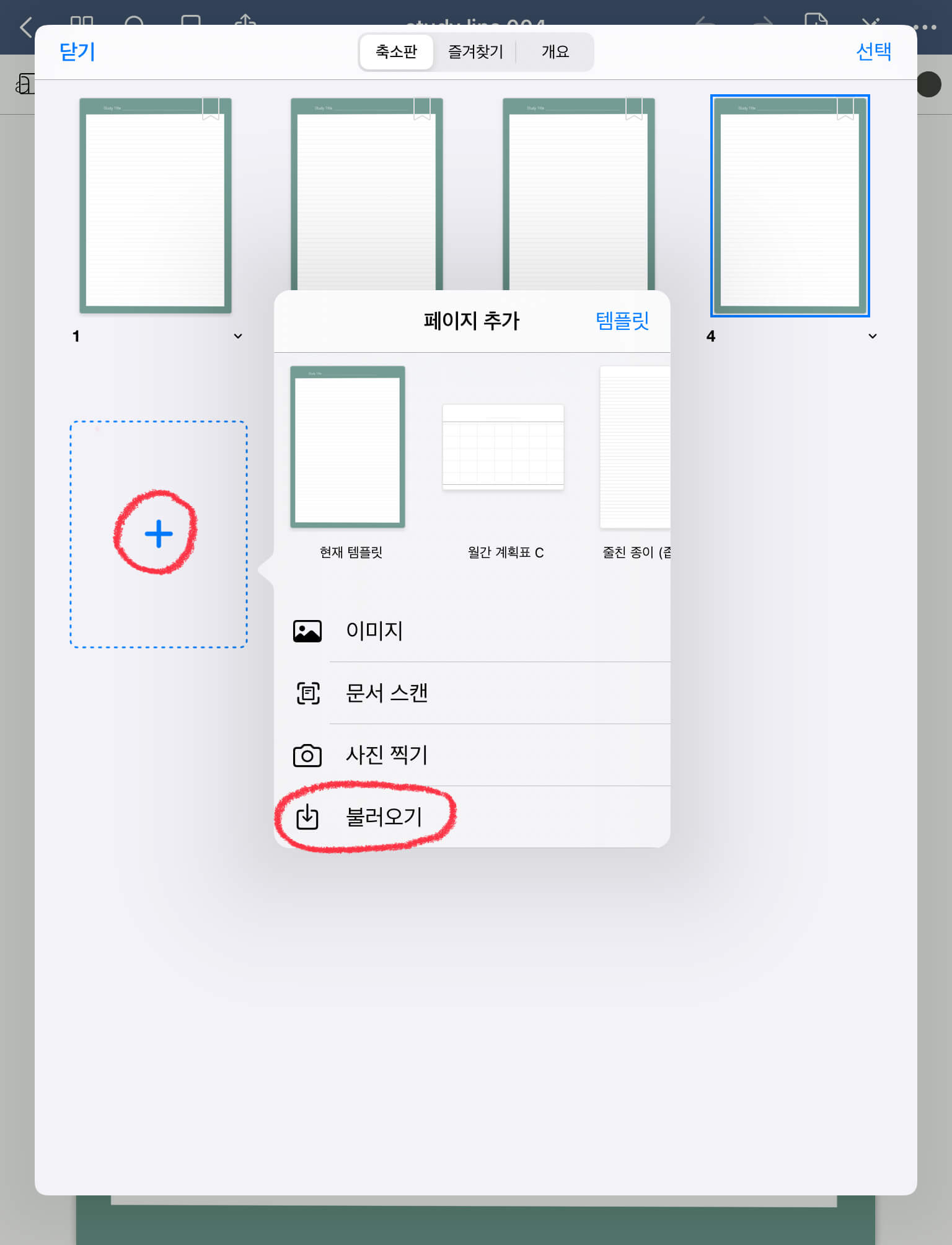이제 [굿노트]를 열어줍니다. 표지를 넣어줄 노트를 열어준 뒤, 왼쪽 상단 [네모 네개] 버튼을 누르면 아래와 같은 화면이 나옵니다. 여기서 [+] - [불러오기] 를 눌러줍니다.