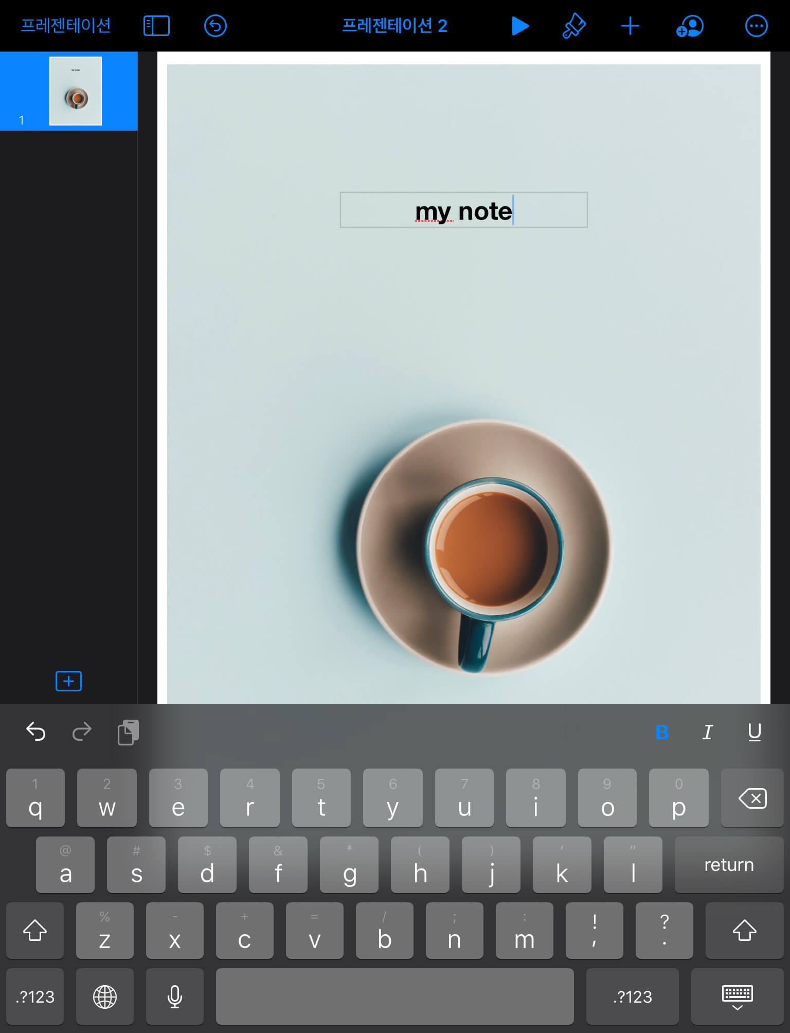 참고로 색상을 변경하고 싶을때, 키노트에서는 [스포이드] 기능을 통해서 기존의 이미지 색상을 추출 할 수 있습니다. 아래와 같이 [붓] - [텍스트] - [텍스트 색상] - [색상] - [오른쪽으로 스와이프] - [스포이드] 기능을 이용하면 이미지와 어울리는 텍스트 색상을 쉽게 설정할 수 있습니다.