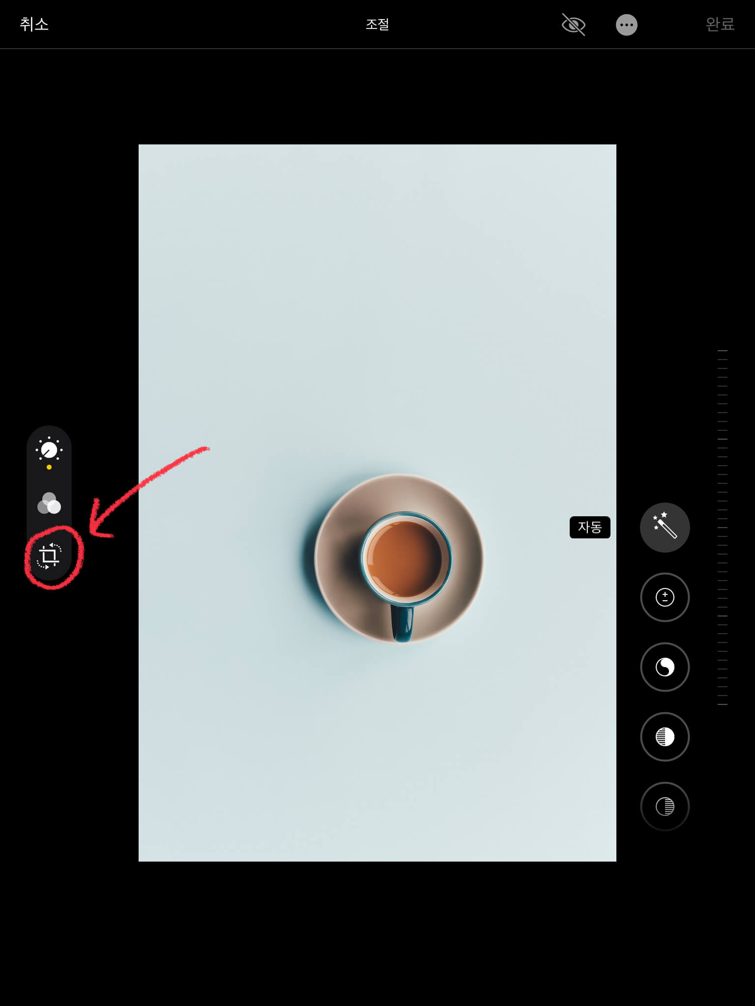 표지에 쓸 이미지를 선택한 후 우측 상단의 [편집]을 누릅니다. (이때 패드 방향을 세로로 해주세요) 그리고 왼쪽의 [자르기] 버튼을 누르면 이미지를 자르거나 크기를 변경할 수 있습니다.
