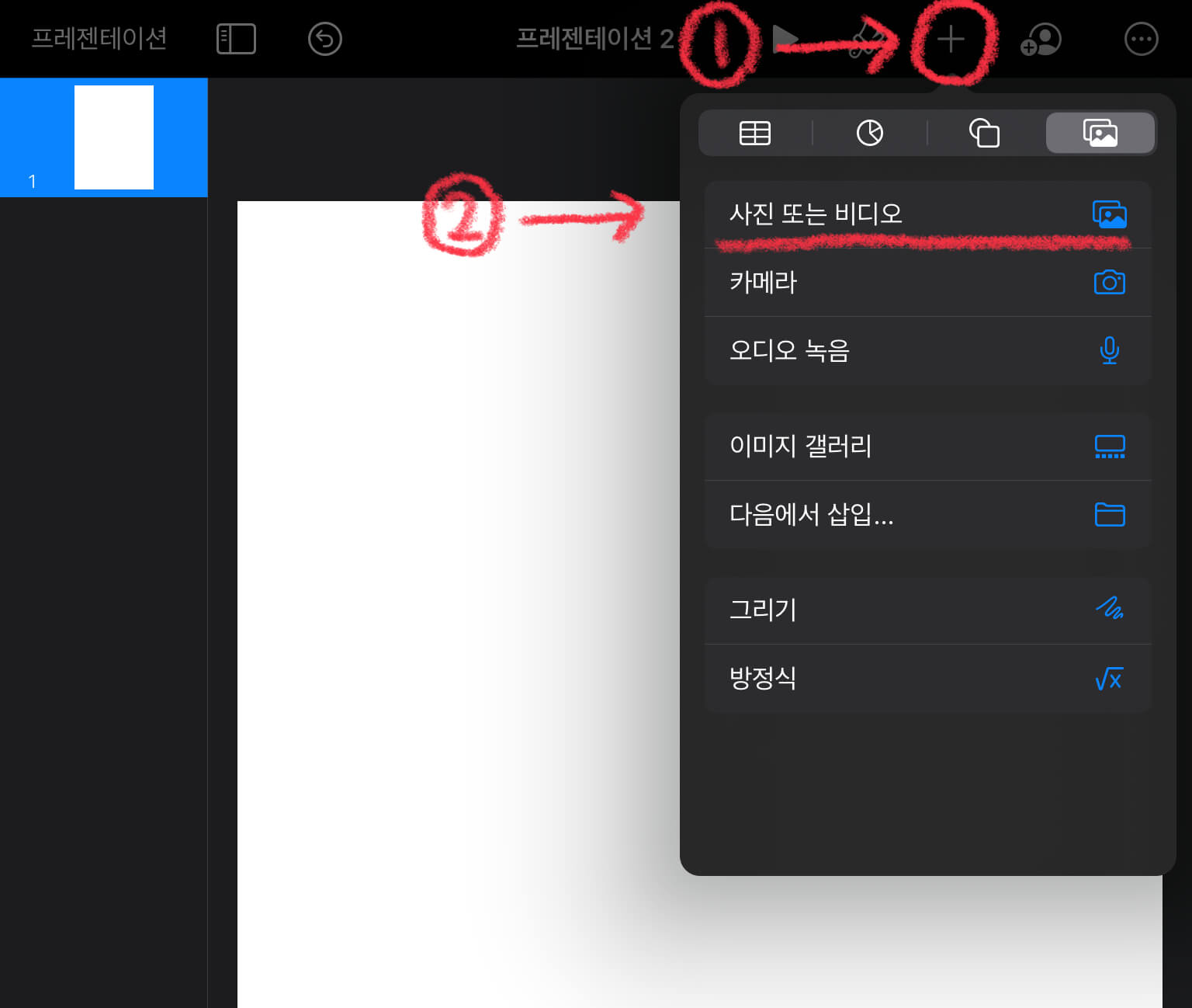 이제 다시 [키노트]로 돌아가서 이미지를 불러옵니다. 키노트에서 이미지 불러오는 방법은 상단 오른쪽 [+] 버튼을 누르고 [사진 또는 이미지]를 누르면 됩니다. 크기를 3:4로 변경해준 표지 이미지를 불러옵니다.