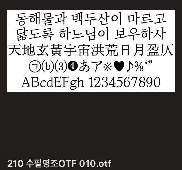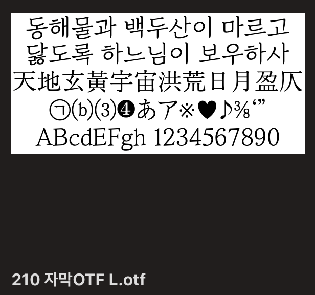 명조체가 살짝 기울어진 모양의 폰트입니다. 역시 디자인 210의 유료 폰트입니다.