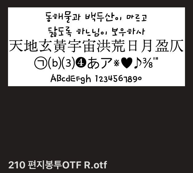 이 외에도 여락이들 영상에서 자주 볼 수 있는 폰트로는 210 언짢은 언짜니, 210 요리조리, 210 편지봉투 등이 있습니다.