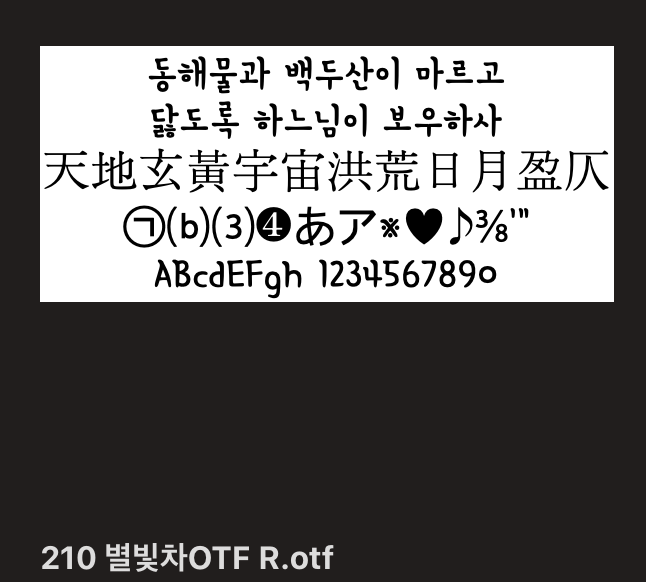 별빛차 라는 폰트입니다. 디자인 210에서 제공하는 폰트입니다. 감성적이고 부드러운 느낌의 폰트입니다.