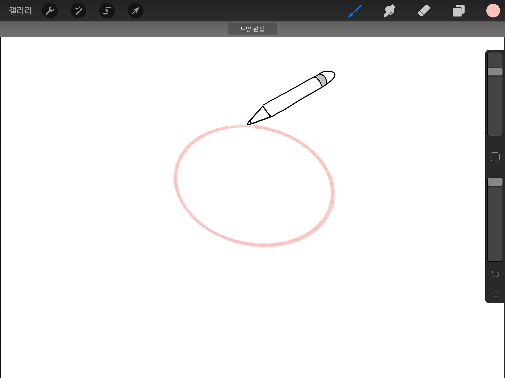 동그라미를 그리고 애플 펜슬을 액정에서 떼지 않고2초 정도 기다리면 아래와 같이 타원 모양이 됩니다.