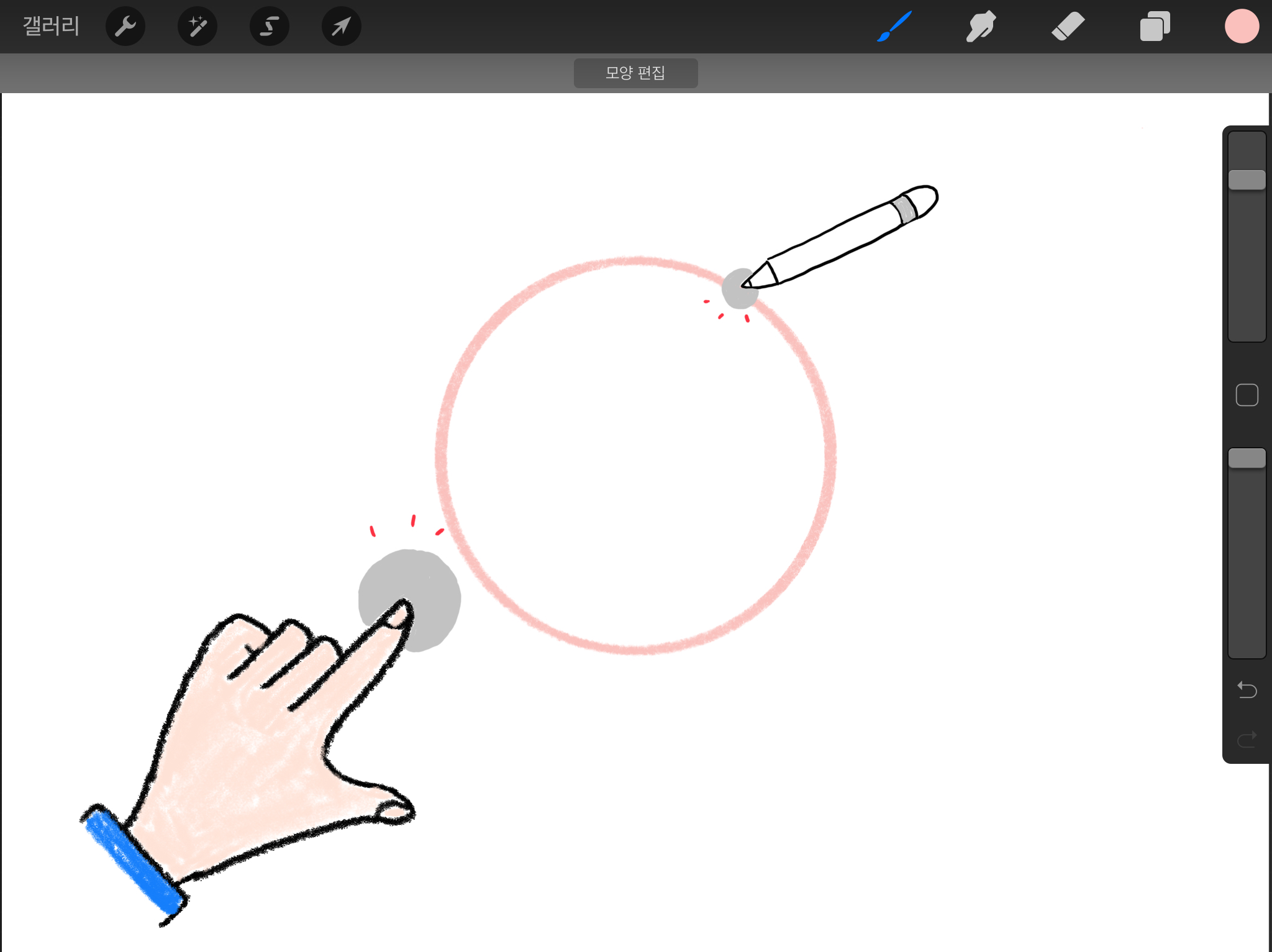 타원 모양이 된 후, 왼 손(반대편 손)을 이용해 한 손가락으로 화면을 터치해주면 동그라미가 됩니다.
