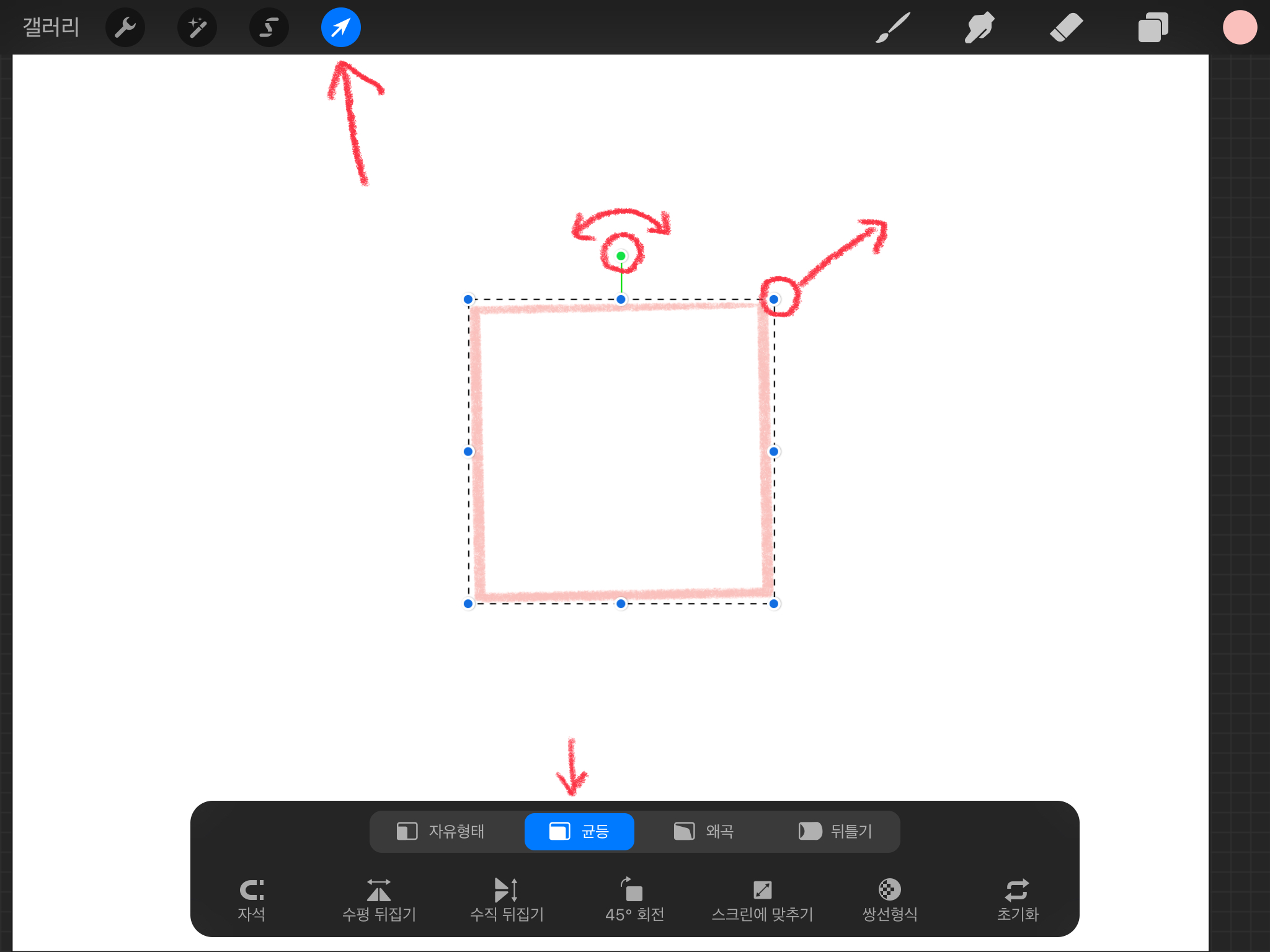 만들어진 도형의 크기와 위치를 바꾸고 싶을 때에는, 아래와 같이 화살표 도구를 눌러줍니다. 이때 아래 [균등]으로 되어있어야 정 사각형 모양이 변하지 않습니다.